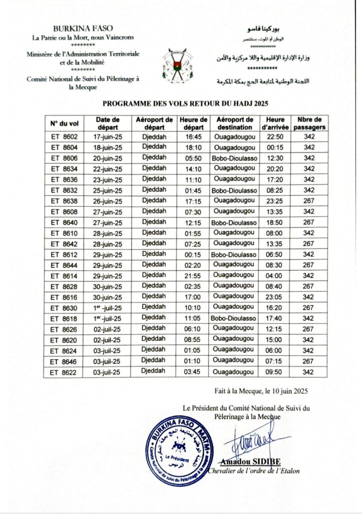 Voici le programme des vols retour des pèlerins burkinabè.