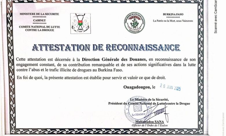 À l’occasion de la 38ᵉ Journée internationale contre l’abus et le trafic illicite de drogues, célébrée le jeudi 26 juin 2025, la Direction Générale des Douanes du Burkina Faso a été honorée par une attestation de reconnaissance pour ses efforts remarquables dans la lutte contre le trafic de drogues. Cette distinction a été décernée par Monsieur le Ministre de la Sécurité, Président du Comité national de lutte contre la drogue.