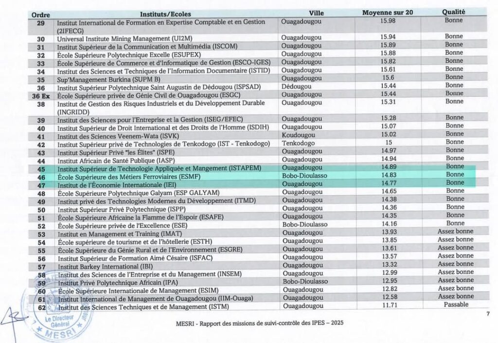 Burkina : ESMF maintient son positionnement dans la catégorie «Bonne qualité» dans le classement 2024 des Institut d’Enseignement supérieur