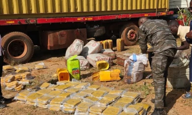Les investigations ont alors révélé l’ampleur du stratagème : le double réservoir, les bidons et même les pneus de secours avaient été transformés en véritables caches pour le transport illicite. Au terme de cette opération minutieuse, 𝟓𝟗𝟑 𝐩𝐥𝐚𝐪𝐮𝐞𝐭𝐭𝐞𝐬 𝐝𝐞 𝐜𝐡𝐚𝐧𝐯𝐫𝐞 𝐢𝐧𝐝𝐢𝐞𝐧 𝐞𝐭 𝟏𝟗𝟒 𝐩𝐥𝐚𝐪𝐮𝐞𝐭𝐭𝐞𝐬 𝐝𝐞 𝐦𝐚𝐫𝐢𝐣𝐮𝐚𝐧𝐚, 𝐩𝐨𝐮𝐫 𝐮𝐧 𝐩𝐨𝐢𝐝𝐬 𝐭𝐨𝐭𝐚𝐥 𝐞𝐬𝐭𝐢𝐦é à 𝐞𝐧𝐯𝐢𝐫𝐨𝐧 𝟓𝟎𝟎 𝐤𝐢𝐥𝐨𝐠𝐫𝐚𝐦𝐦𝐞𝐬, ont été extraites du véhicule. La valeur marchande de la saisie est évaluée à 𝟕𝟖 𝟕𝟎𝟎 𝟎𝟎𝟎 𝐟𝐫𝐚𝐧𝐜𝐬 𝐂𝐅𝐀.