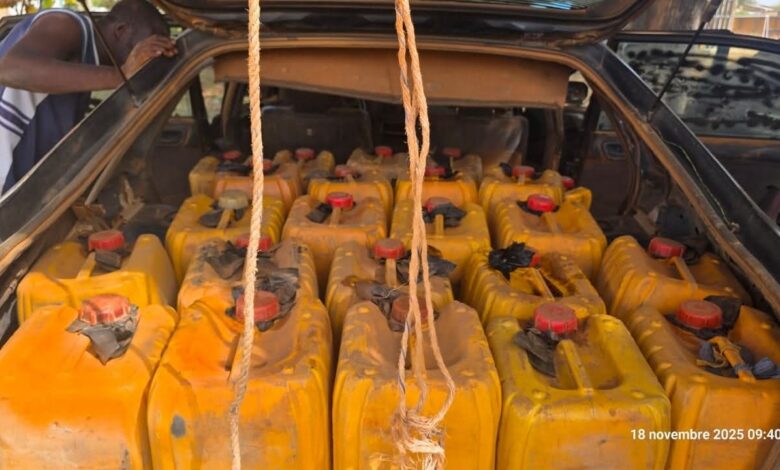 Coup d’arrêt sec pour deux réseaux clandestins d’hydrocarbures : la 𝐁𝐫𝐢𝐠𝐚𝐝𝐞 𝐌𝐨𝐛𝐢𝐥𝐞 𝐝𝐞𝐬 𝐃𝐨𝐮𝐚𝐧𝐞𝐬 𝐝𝐞 𝐌𝐚𝐧𝐠𝐚 a intercepté, dans la nuit du 18 novembre 2025, 𝟓𝟎 𝐛𝐢𝐝𝐨𝐧𝐬 𝐝’𝐞𝐬𝐬𝐞𝐧𝐜𝐞 𝐝𝐞 𝟐𝟓 𝐥𝐢𝐭𝐫𝐞𝐬, 𝐬𝐨𝐢𝐭 𝟏 𝟐𝟓𝟎 𝐥𝐢𝐭𝐫𝐞𝐬. Le vendredi 21 novembre 2025, c’était au tour du 𝐁𝐮𝐫𝐞𝐚𝐮 𝐝𝐞𝐬 𝐃𝐨𝐮𝐚𝐧𝐞𝐬 𝐝𝐞 𝐙𝐚𝐛𝐫é de saisir 𝟒𝟓 𝐛𝐢𝐝𝐨𝐧𝐬 𝐝𝐞 𝟐𝟓 𝐥𝐢𝐭𝐫𝐞𝐬, 𝐬𝐨𝐢𝐭 𝟏 𝟏𝟐𝟓 𝐥𝐢𝐭𝐫𝐞𝐬.