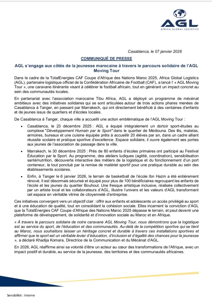 Dans le cadre de la TotalEnergies CAF Coupe d’Afrique des Nations Maroc 2025, Africa Global Logistics (AGL), partenaire logistique officiel de la Confédération Africaine de Football (CAF), a lancé l’ « AGL Moving Tour », une caravane itinérante visant à célébrer le football africain, tout en générant un impact concret au sein des communautés locales.