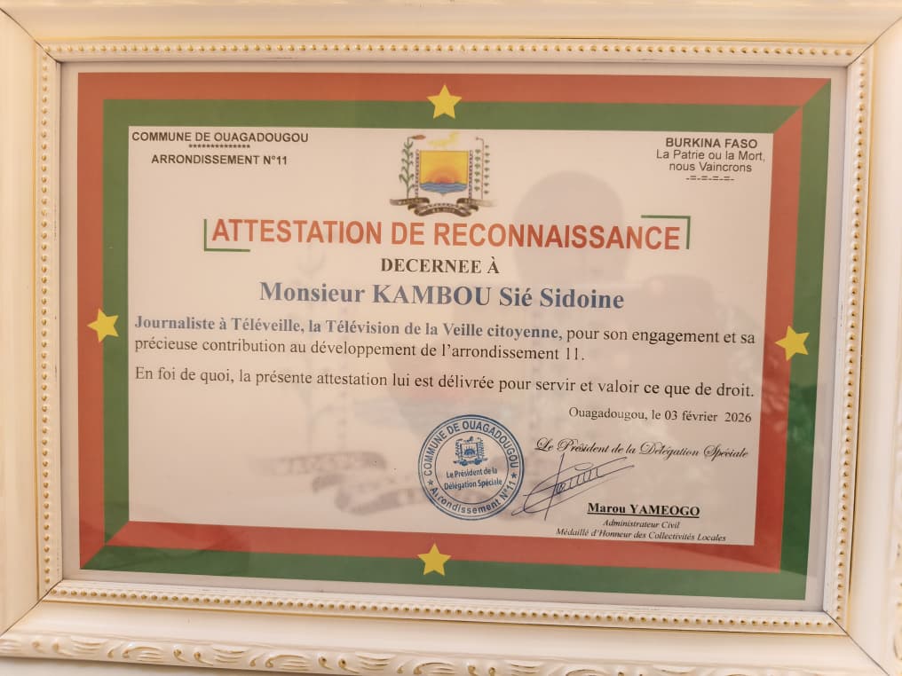La mairie de l’arrondissement 11 de la commune de Ouagadougou a organisé, ce mardi 3 février 2026 à Karpala, une cérémonie d’hommage à l’endroit de 146 ses partenaires qui l’accompagnent dans la mise en œuvre de ses activités, ainsi qu’à ceux qui ont mené des actions significatives au sein de l’arrondissement. Parmi les récipiendaires, figure Kambou Sié Sidoine, journaliste et directeur de publication de Téléveille, la télévision de la veille citoyenne.