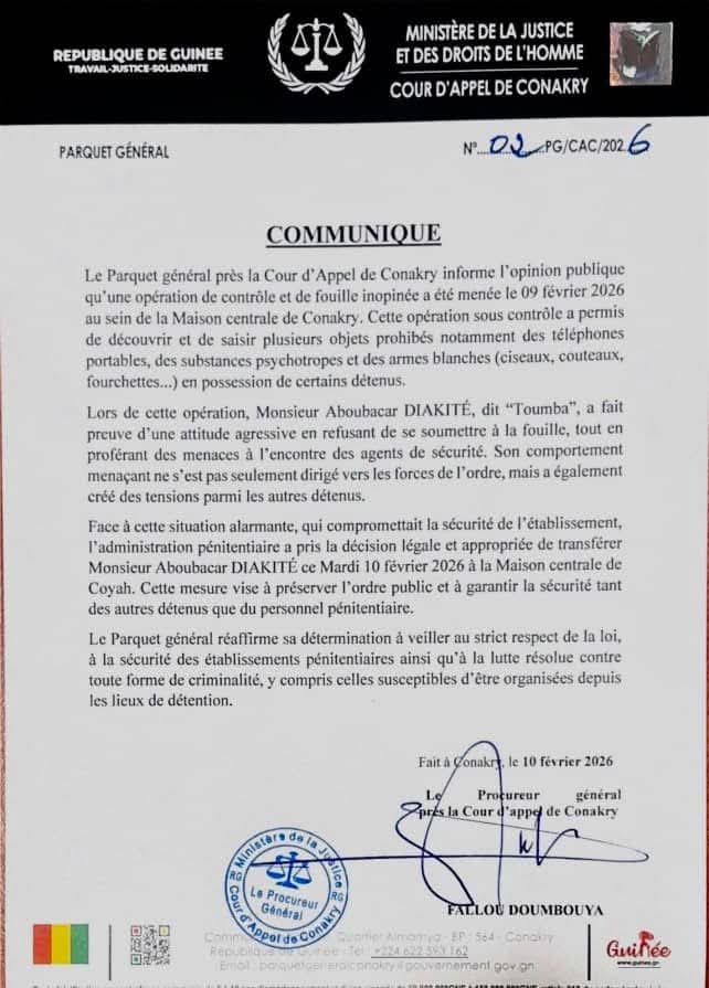Le Parquet général indique que Toumba a adopté une attitude agressive, refusant de se soumettre à la fouille et proférant des menaces à l’encontre des agents de sécurité, créant ainsi des tensions parmi les détenus. Face à cette situation jugée alarmante et compromettant la sécurité de l’établissement, l’administration pénitentiaire a décidé de son transfert vers la prison de Coyah afin de préserver l’ordre et la sécurité.
