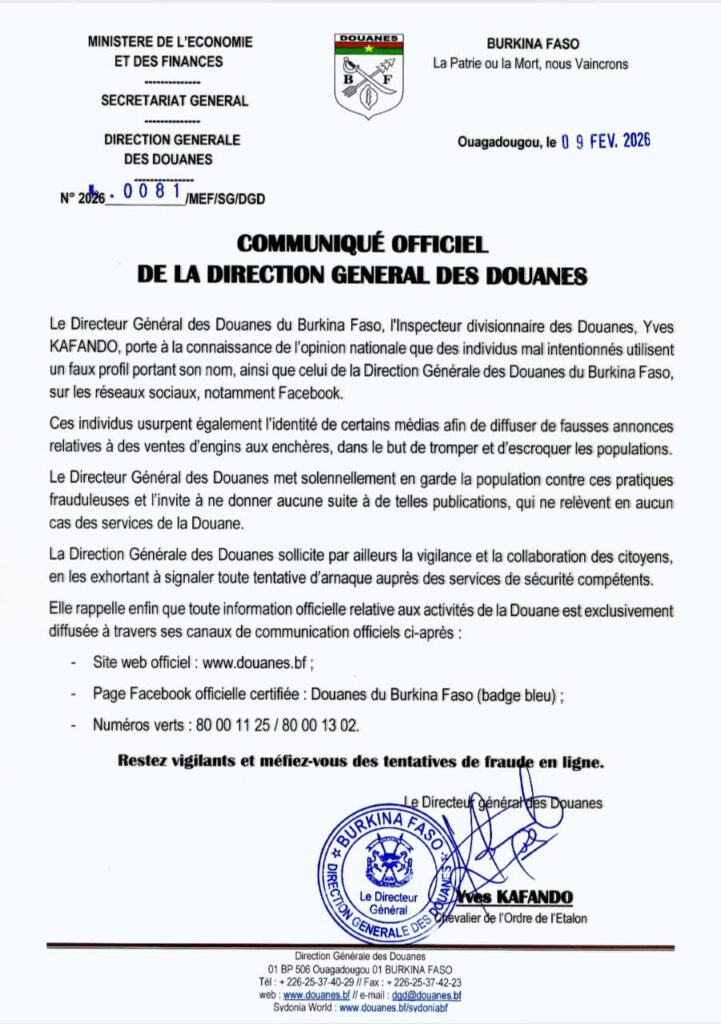 « Le Directeur Général des Douanes du Burkina Faso, l’Inspecteur divisionnaire des Douanes, Yves KAFANDO, porte à la connaissance de l’opinion nationale que des individus mal intentionnés utilisent un faux profil portant son nom, ainsi que celui de la Direction Générale des Douanes du Burkina Faso, sur les réseaux sociaux, notamment Facebook. Ces individus usurpent également l’identité de certains médias afin de diffuser de fausses annonces relatives à des ventes d’engins aux enchères, dans le but de tromper et d’escroquer les populations.
